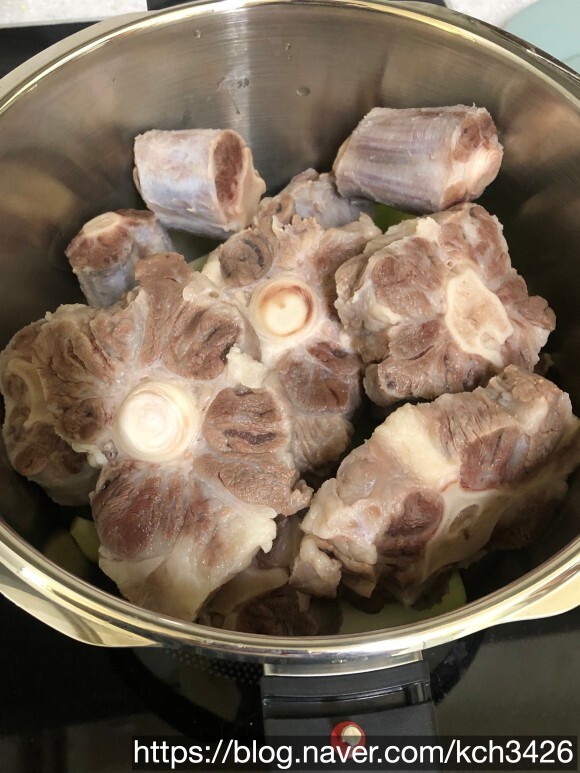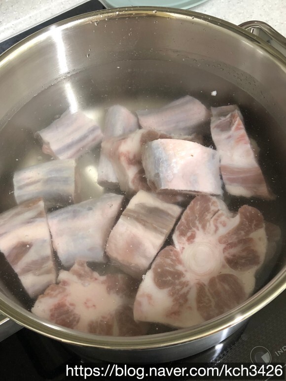 핏물 뺀 꼬리를 냄비에 넣고 초벌 삶기 15분 정도 해준 뒤 건져내어 찬물에 꼬리를 씻어준다. 이때 불순물과 불필요한 기름기가 떨어져 나가 더 깨끗한 고기가 됨!