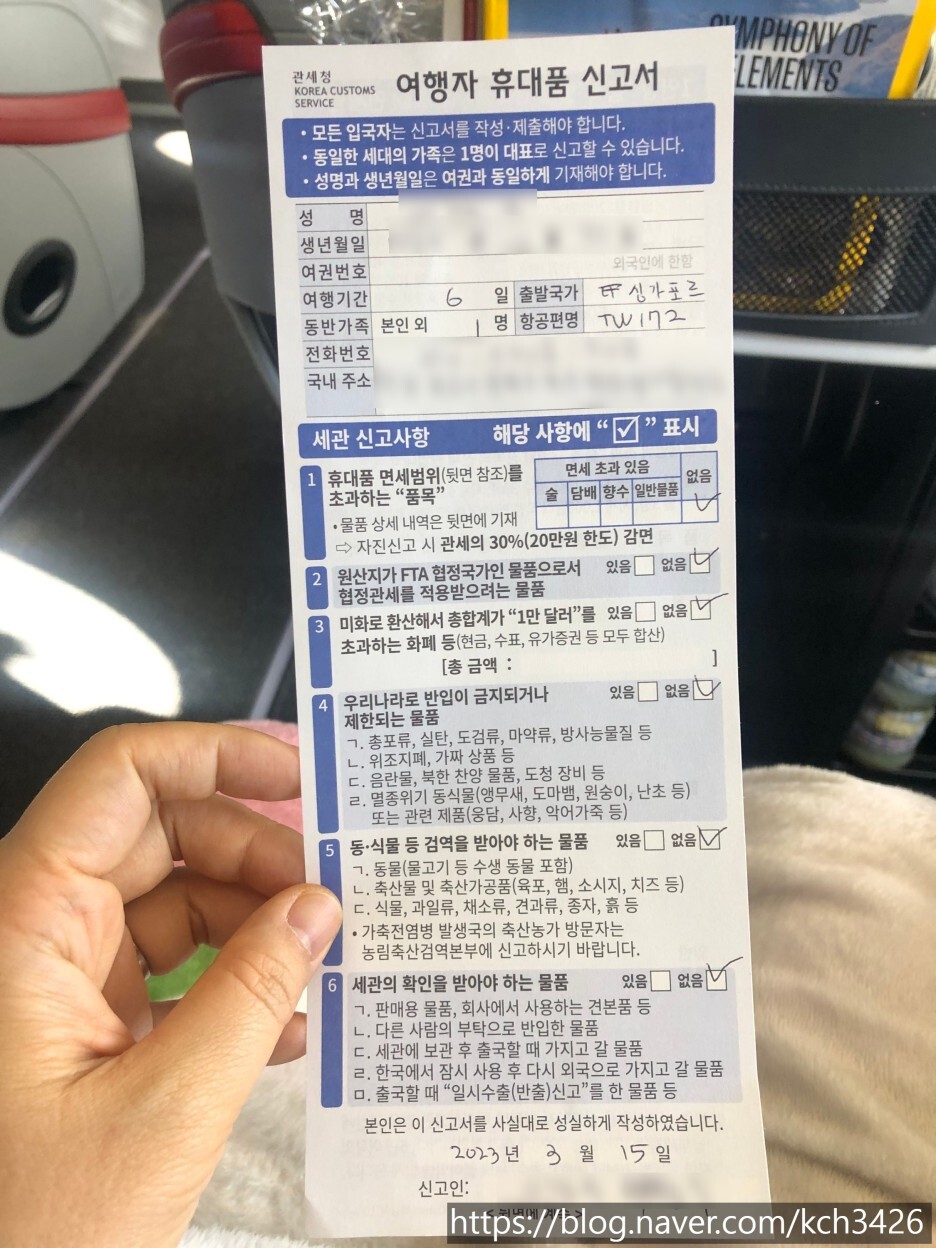 탑승 후 이륙하면 건강 상태 질문서와 휴대품 신고서를 쓰게 된다. 양식에 맞춰서 잘 작성한 후 인천공항에 도착하면 입국 심사대에 제출하면 된다.